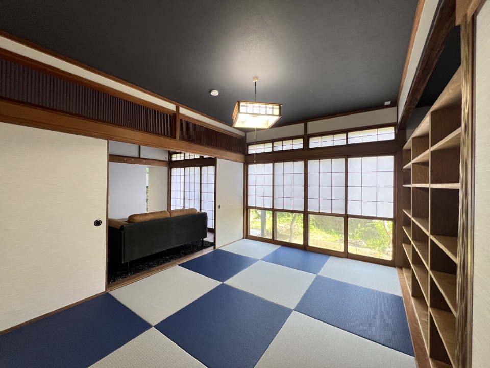 真壁の和の雰囲気を活かしながら、「シックな和室が一つ欲しい」というご主人の希望を叶えた銀鼠色と藍色の半畳タタミに欄間を残した和室。障子越しの美しい彩光が、訪れた人に感動を与えるお庭空間パノラマビュー。